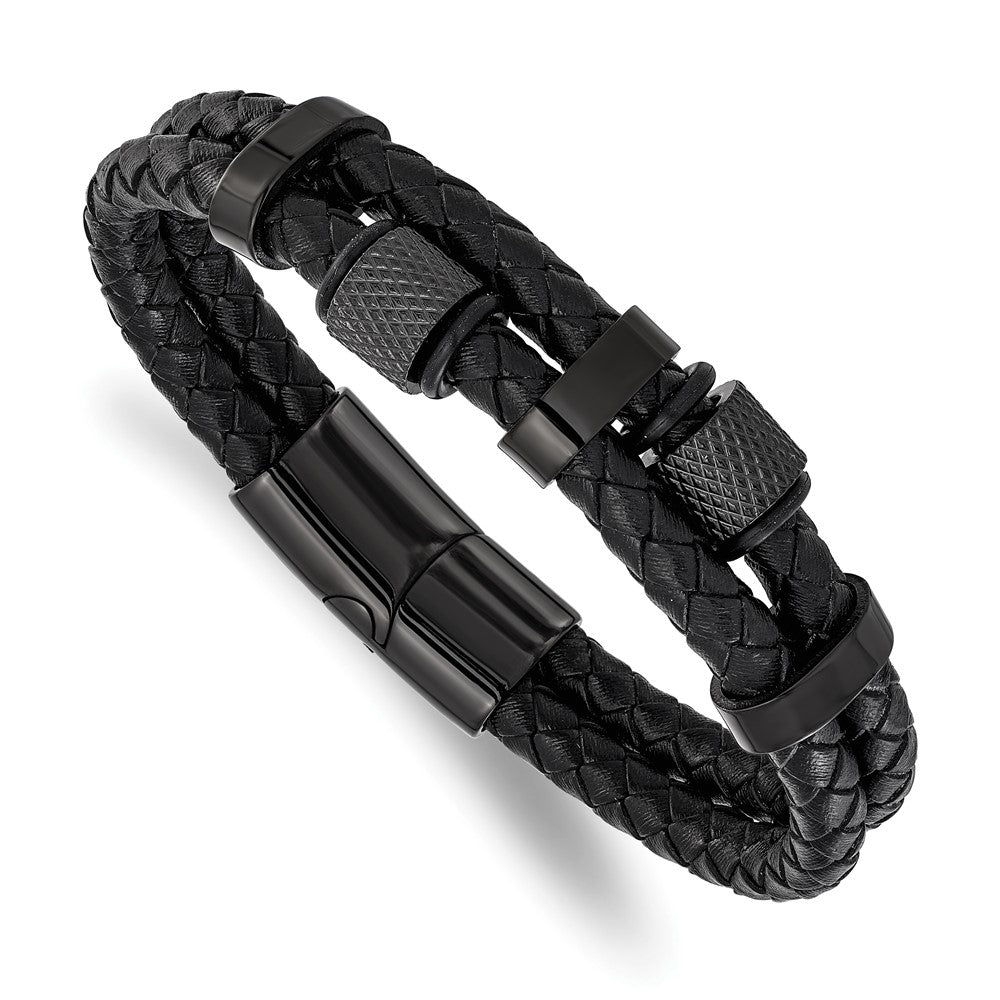 Chisel Stainless Steel Polished Black IP-plated and Black Leather Two Strand 8.25 inch Bracelet