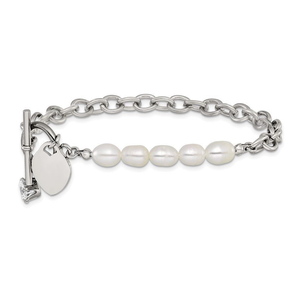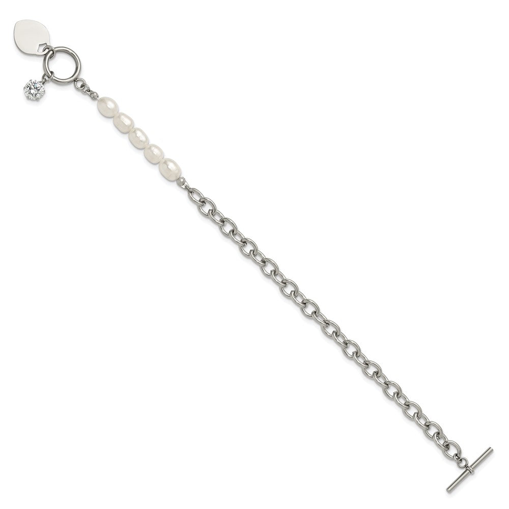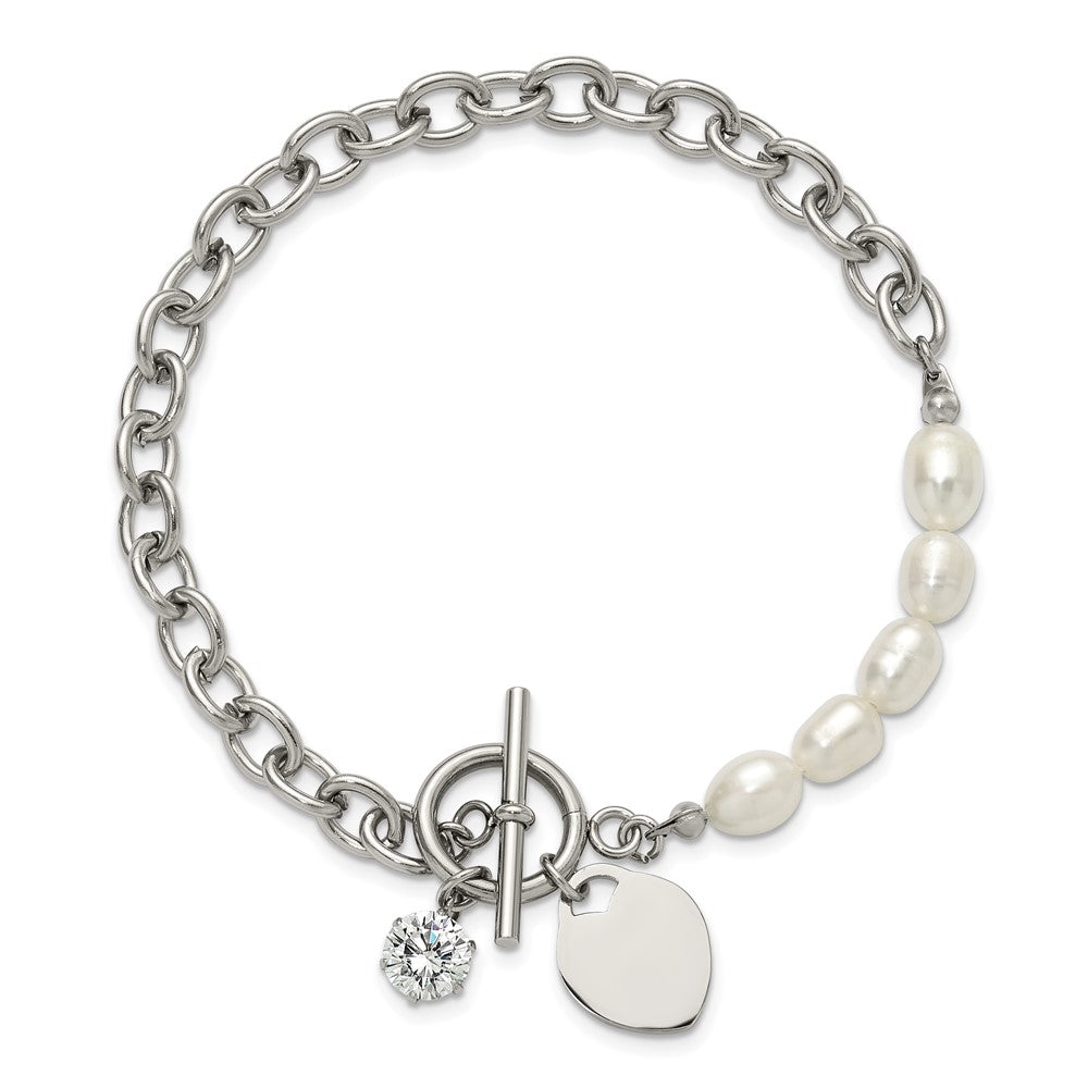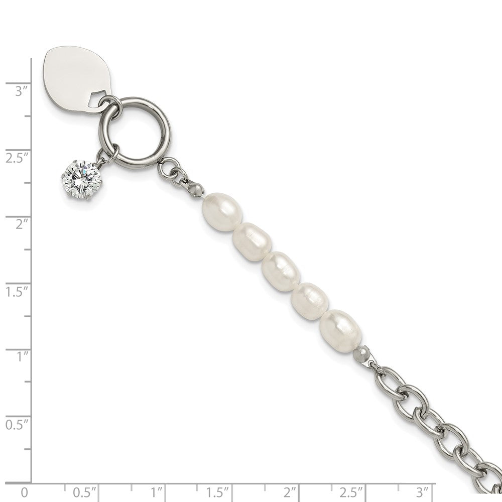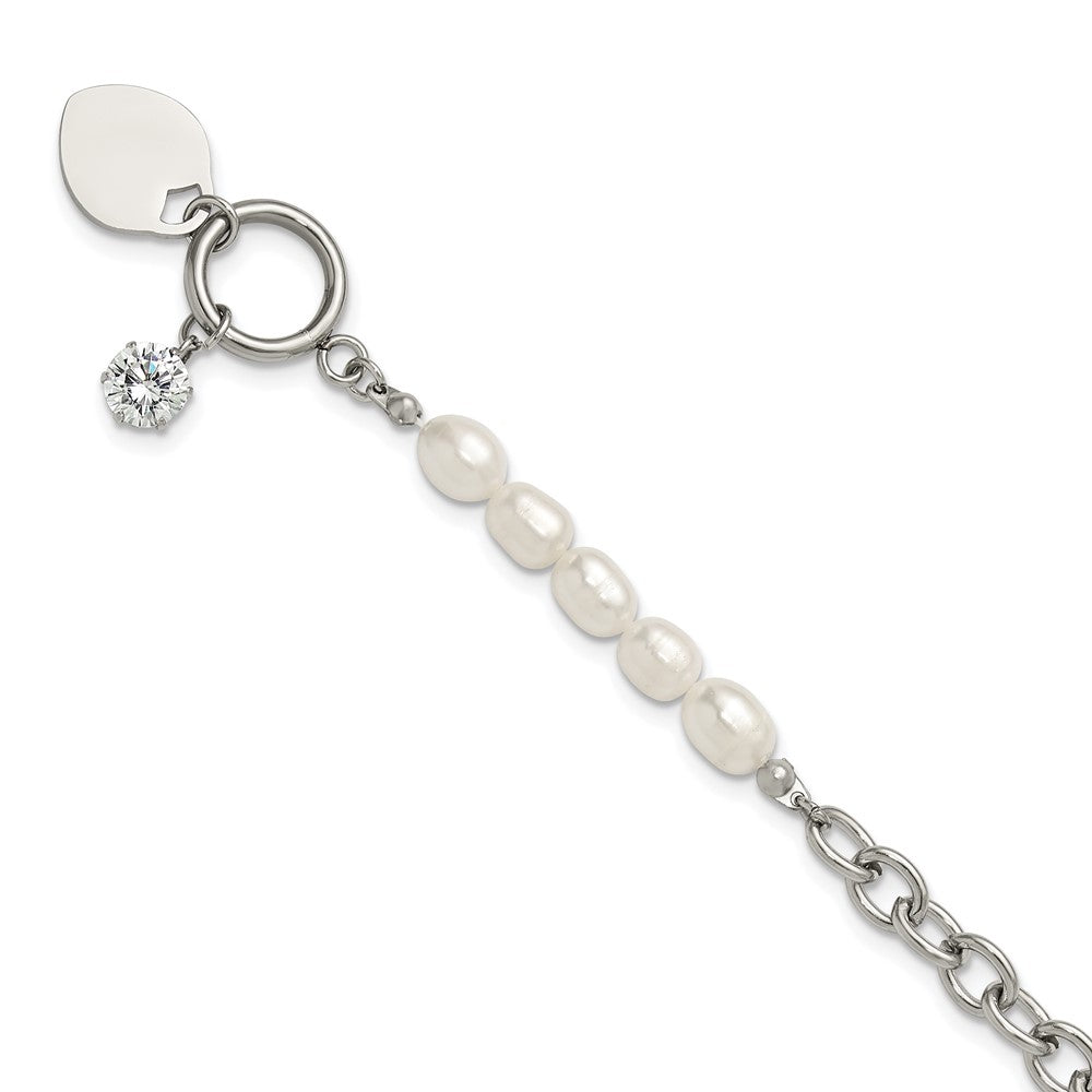 Chisel Stainless Steel Polished with Half White Freshwater Cultured Pearl and CZ Heart Dangle 8.25 inch Bracelet