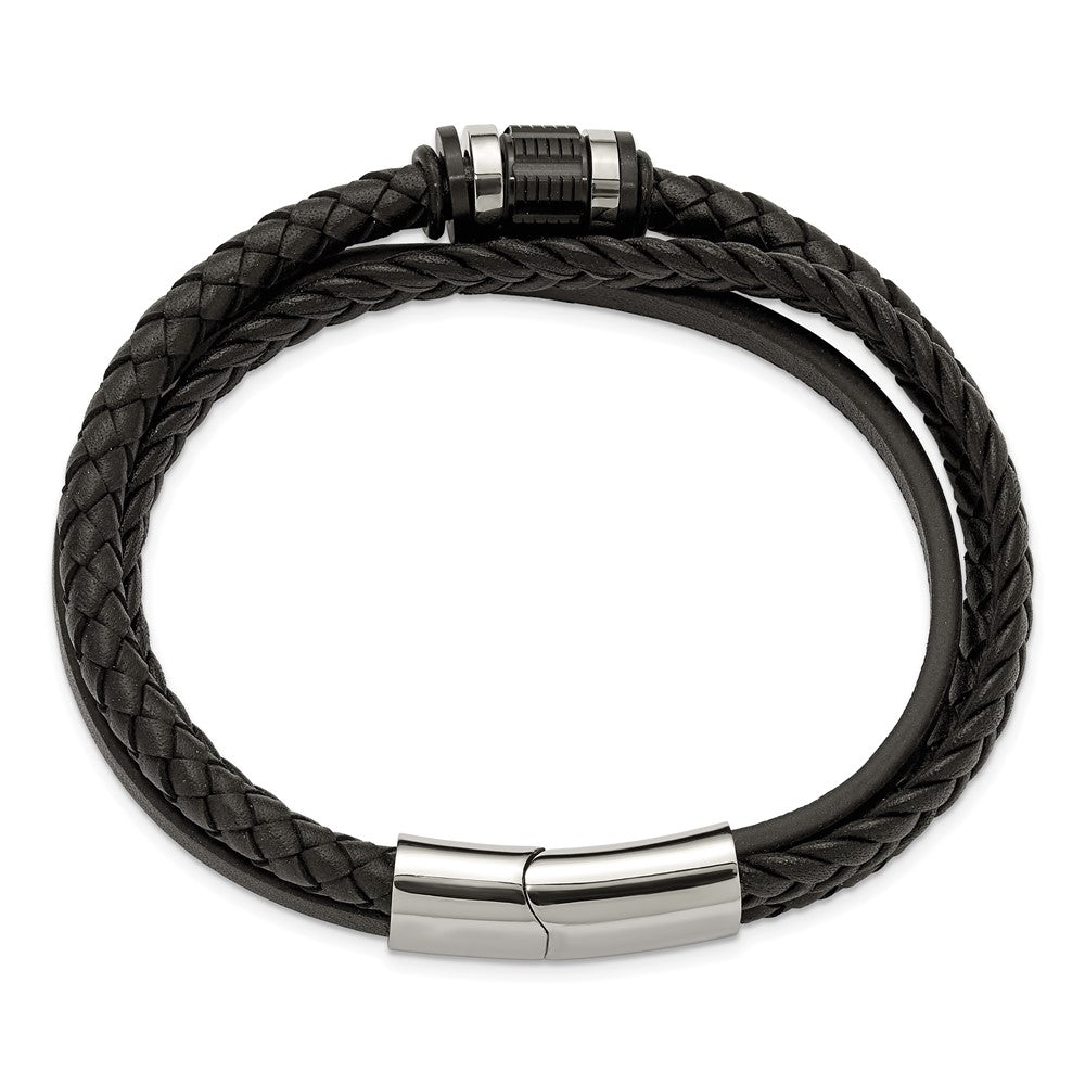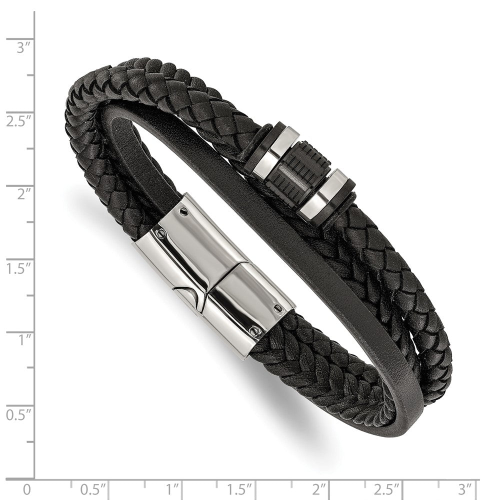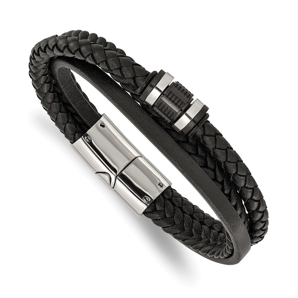 Chisel Stainless Steel Polished Black Leather Multi Strand 8.5 inch Bracelet