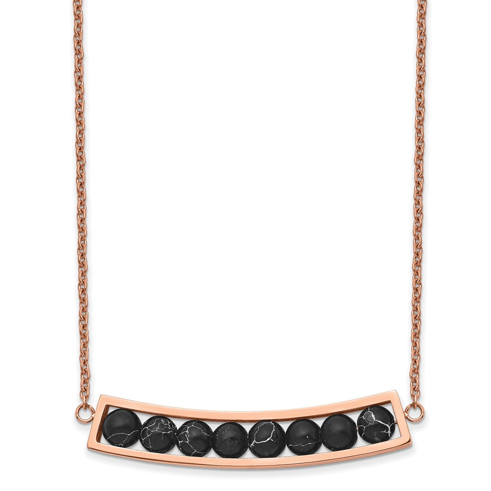 Chisel Stainless Steel Polished Rose IP-plated Bar with Black Grain Stone on a 17.5 inch Cable Chain with a 2 inch Extension Necklace