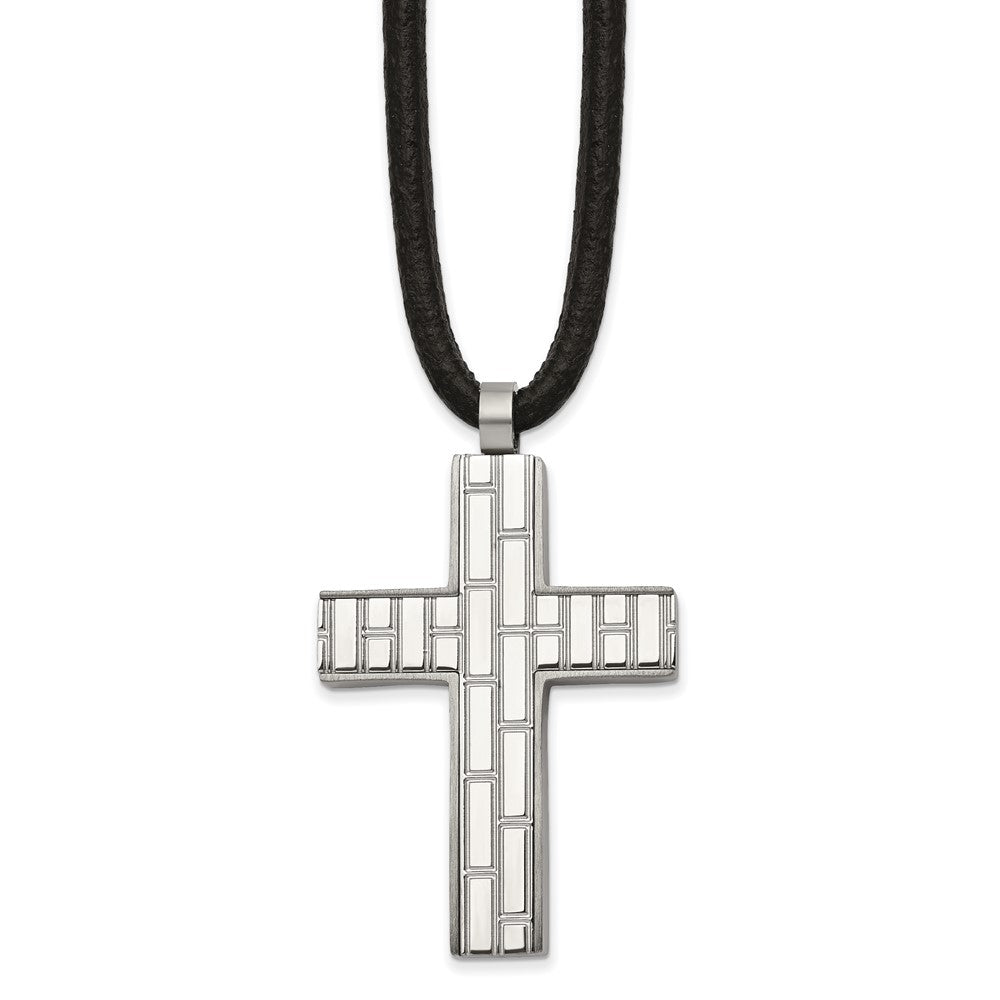 Chisel Stainless Steel Brushed and Polished Brick Design Cross on a Pendant 19.5 inch Black Rubber Cord Necklace